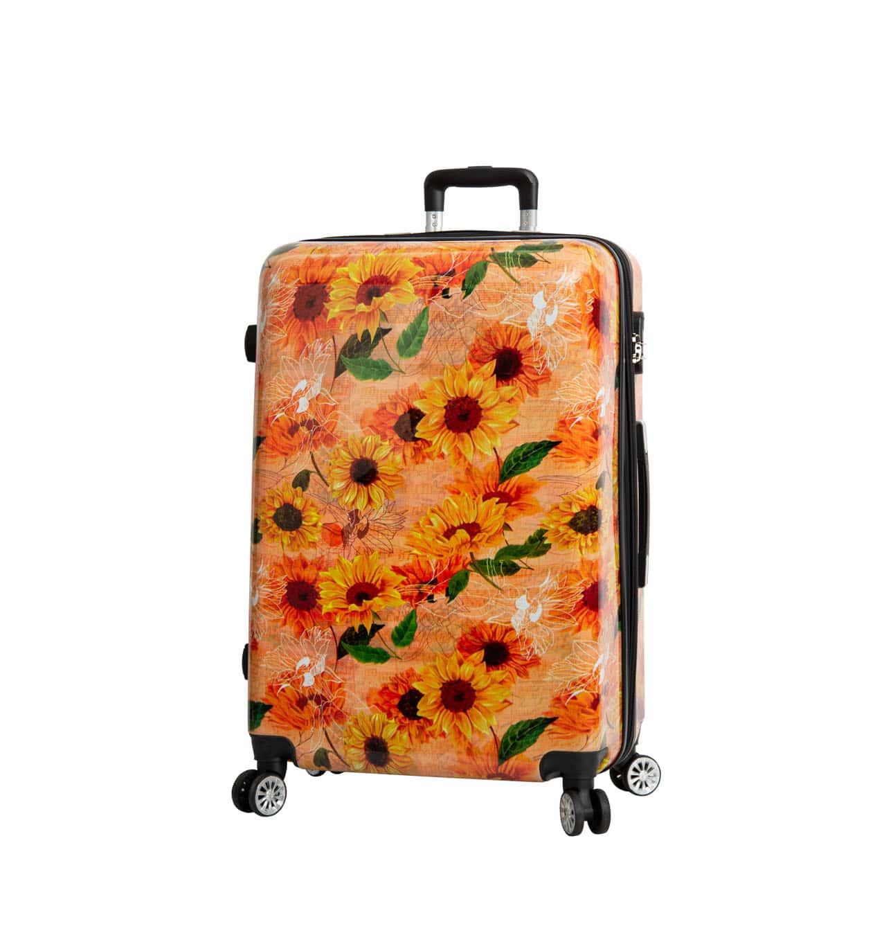 Sa coque en polycarbonate de haute qualité assure une protection optimale de vos effets personnels tout au long de votre voyage. De plus, elle est ornée d’imprimés de peintures de fleurs et de tournesols sur un fond orange, ajoutant une touche de beauté et de vivacité à votre valise.